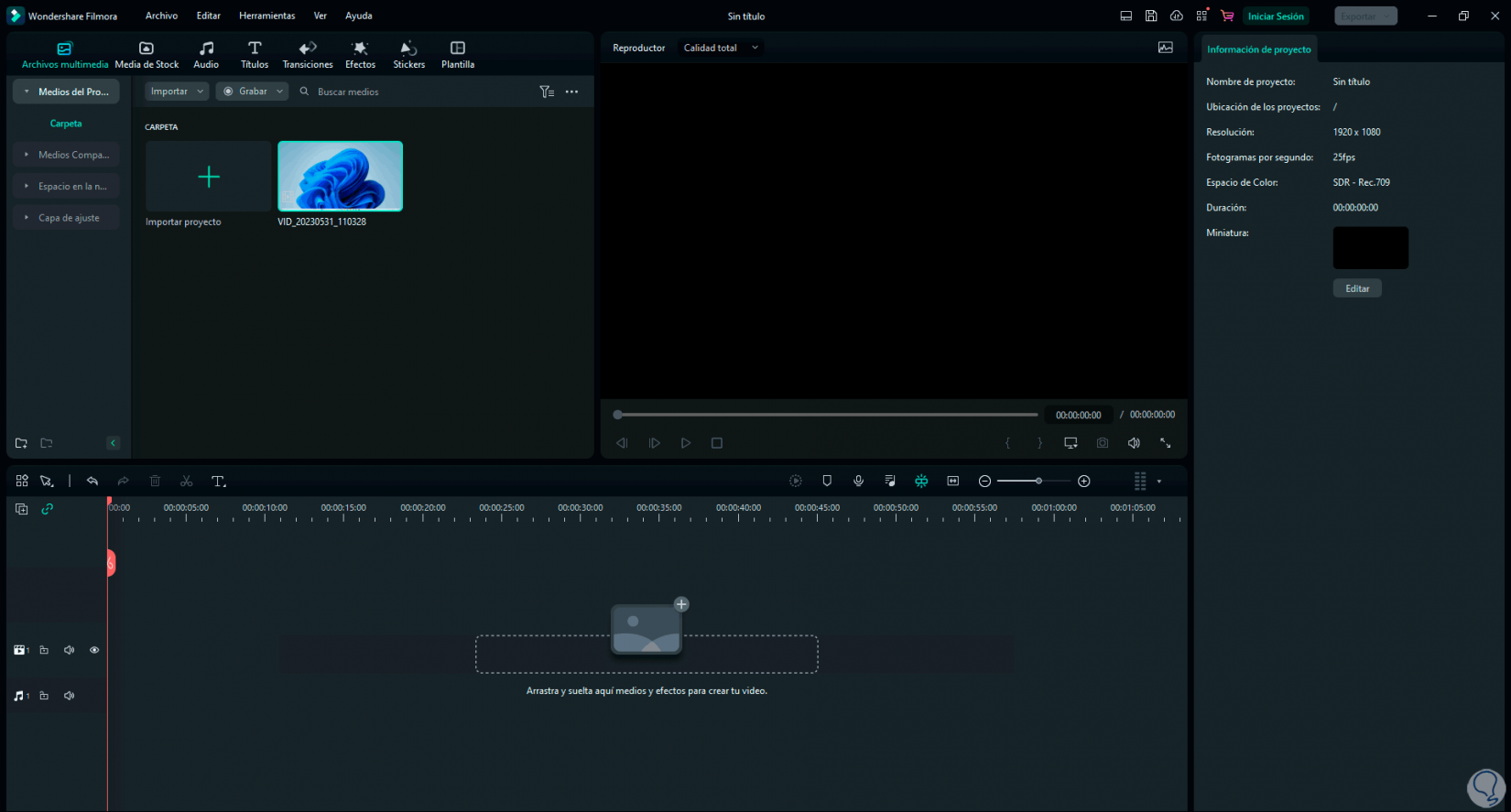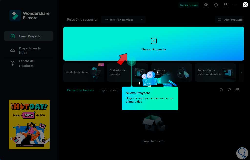 y en un momento Filmora se iniciará en Windows. Damos clic en “Nuevo proyecto” para tener acceso a toda la consola de Filmora la cual dispone de un amplio grupo de opciones