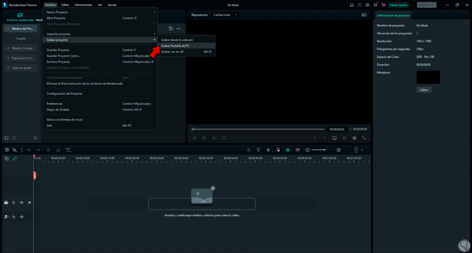 , para grabar nuestra pantalla del PC, iremos al menú “Archivo - Grabar proyecto - Grabar pantalla de PC”: