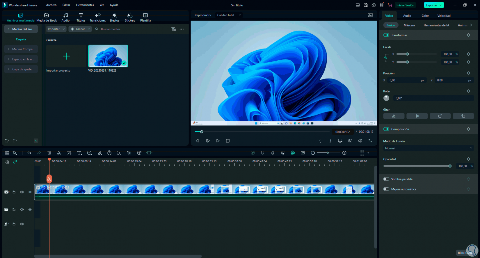 Allí podemos arrastrarla a la ventana de transición para ver como quedó la grabación y trabajar en ella:
