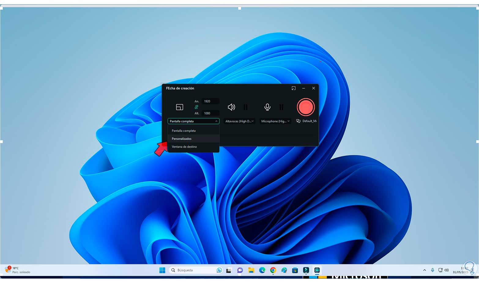 En esta nueva ventana es posible definir parámetros de la pantalla a grabar, por ejemplo podemos definir si se grabara toda la pantalla o solo una parte de ella: