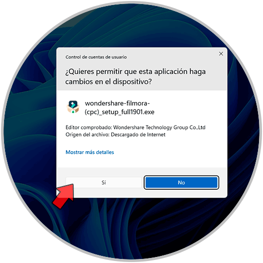 Allí descargamos Filmora, una vez descargado damos clic sobre el ejecutable y será necesario aceptar el permiso en la ventana desplegada: