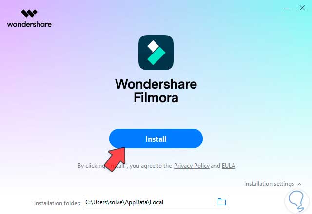 Damos clic en el botón “Install” para que se de paso al proceso de instalación de Filmora en el pc: