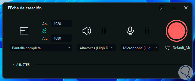Si deseamos podemos grabar el sonido y micrófono, ahora podemos dar clic en AJUSTES para tener acceso a una serie de opciones de configuración adicionales de Filmora: