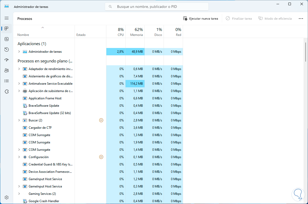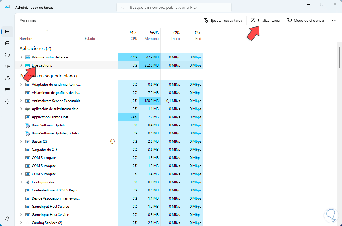 Por defecto se abrirá en la sección Procesos en el Administrador de tareas, allí vamos a seleccionar el proceso llamado “Live captions”: