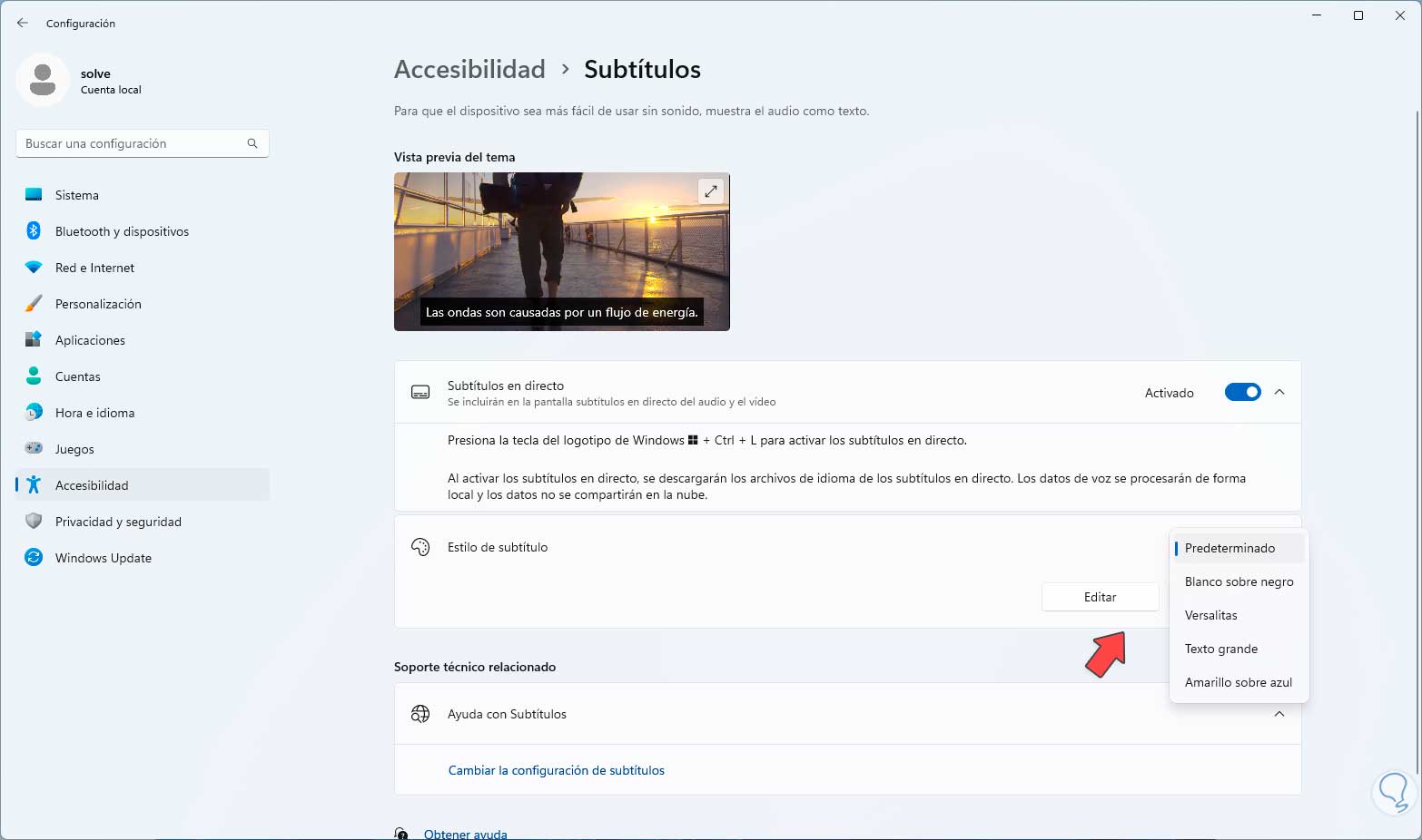 Al activar el interruptor Subtítulos en directo se abrirá la opción de los subtítulos en Windows 11: