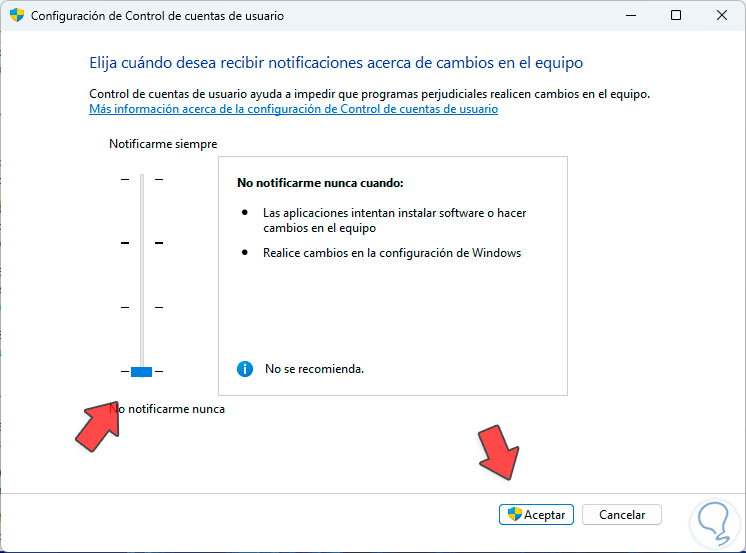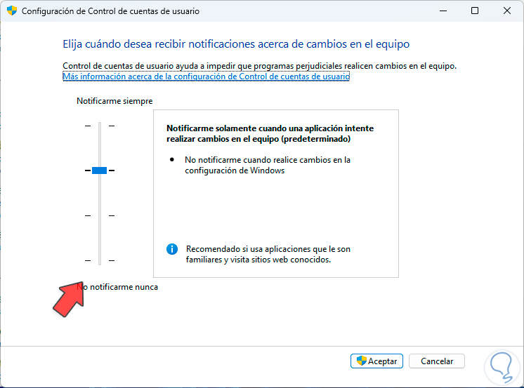Acá damos clic en “Cambiar configuración de Control de cuentas de usuario”, se abrirá la siguiente ventana: