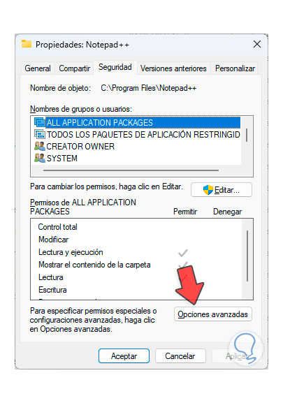 Vamos a la pestaña “Seguridad”. Vamos a dar clic en el botón “Opciones avanzadas” para ver lo siguiente: