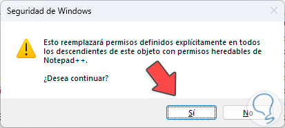 Ahora vamos a seleccionar de nuevo la línea “Everyone” y activamos la casilla “Reemplazar todas las entradas de permisos de objetos secundarios por entradas de permisos heredables de este objeto”. Damos clic en “Aplicar” y se abrirá lo siguiente. Damos clic en “Si” para confirmar el proceso.
