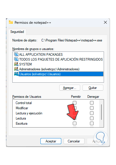 Ahora vamos a seleccionar la línea “Usuarios” y en la parte inferior activamos la casilla “Escritura”: