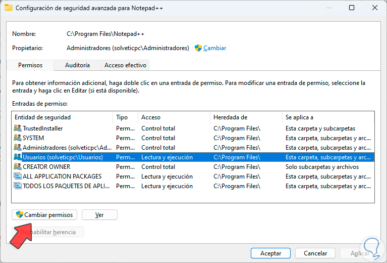 Vamos a seleccionar la línea “Usuarios” y damos clic en “Cambiar permisos” en la parte inferior para que se abra la siguiente ventana: