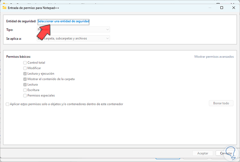 Damos clic en “Seleccionar una entidad de seguridad” para activar las opciones: