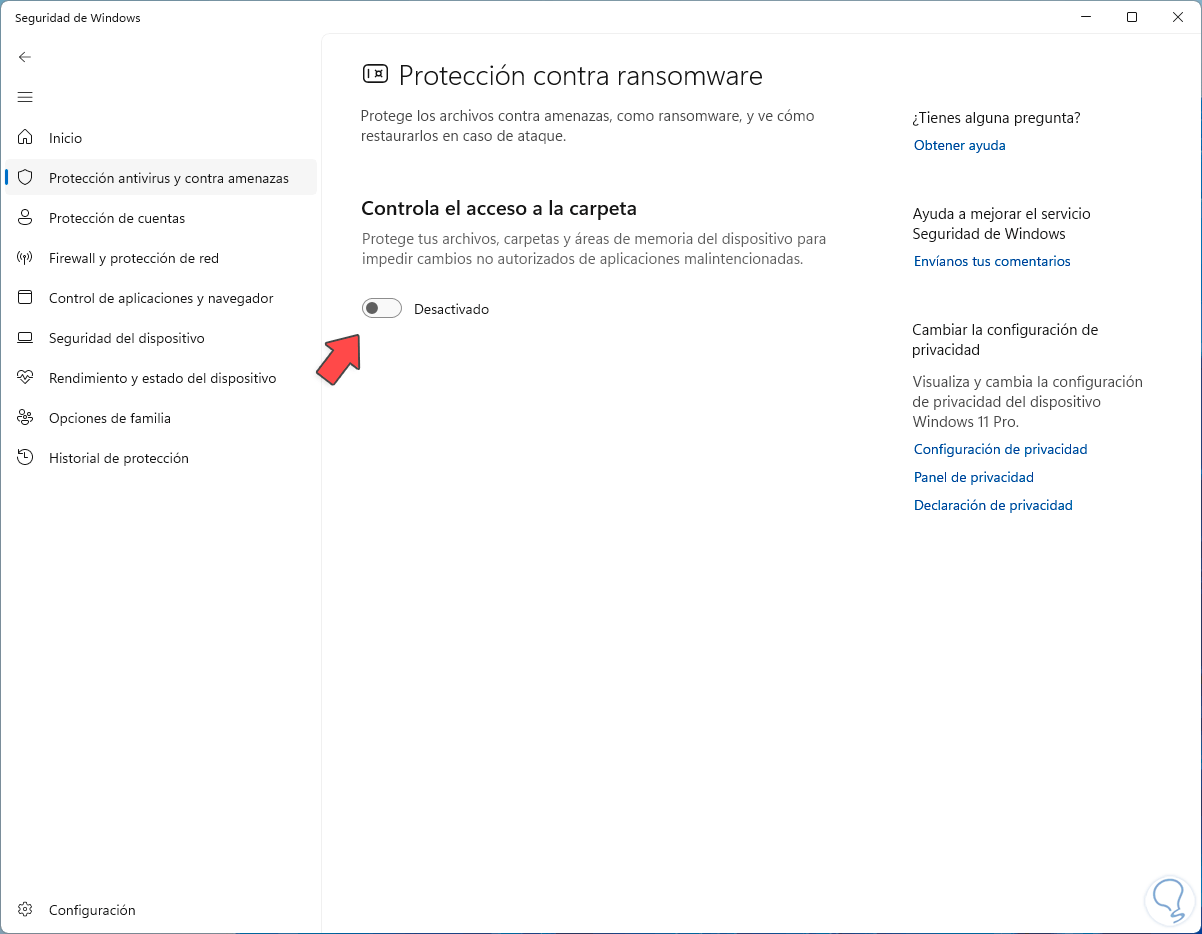 En Windows 11 se ha añadido esta función con la cual es posible controlar el acceso a una carpeta haciendo uso de los permisos de archivo y las configuraciones de seguridad predefinidas y la causa del error es que esta función puede asumir que la aplicación posee una potencial amenaza para el sistema y bloquea su ejecución, en este caso podemos desactivar esta función para luego validar si es posible o no administrar el proceso con fallo.