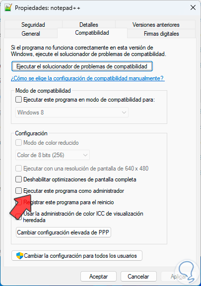 Vamos a la pestaña “Compatibilidad”. Allí vamos a activar la casilla llamada “Ejecutar este programa como administrador”: