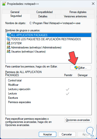 En la ventana emergente vamos a la pestaña “Seguridad”. Damos clic en el botón “Editar” para ver lo siguiente: