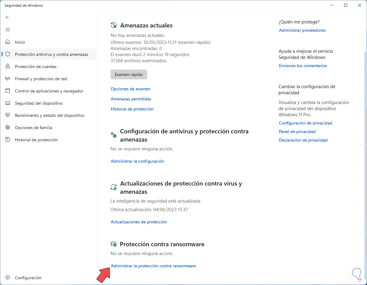 En la parte inferior de las opciones damos clic en “Administrar la protección contra ramsomware”,