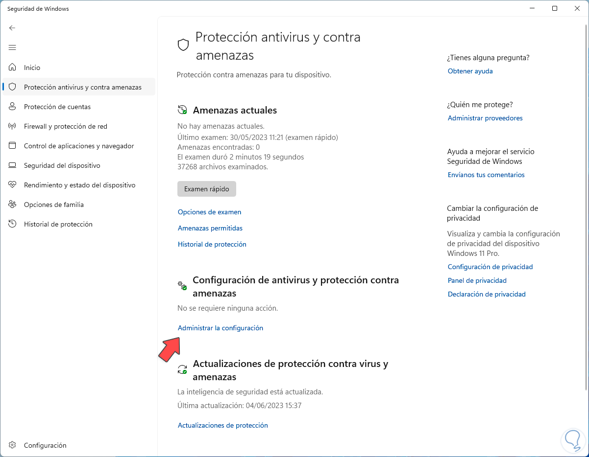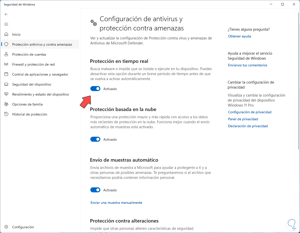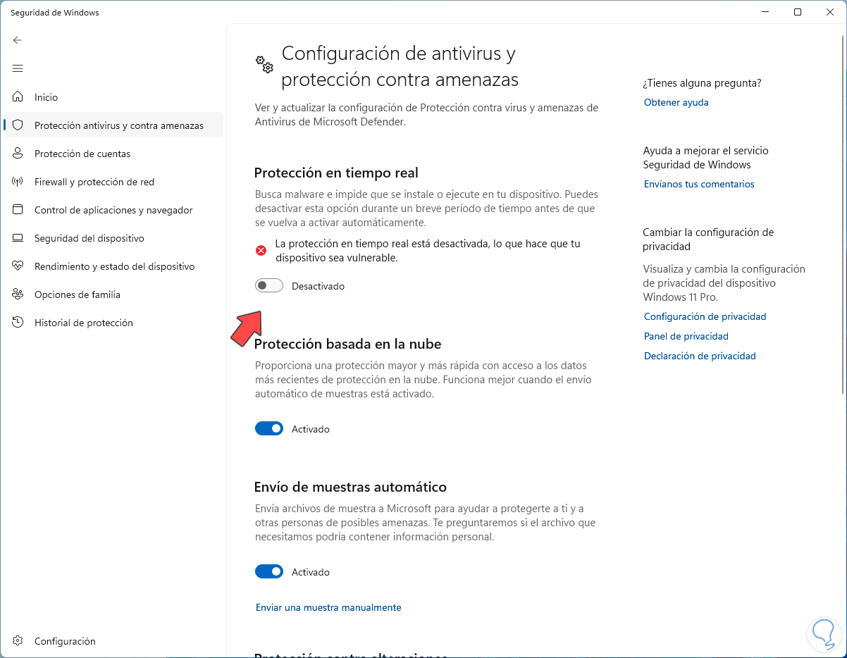 Veremos lo siguiente. Vamos a desactivar el interruptor “Protección en tiempo real”