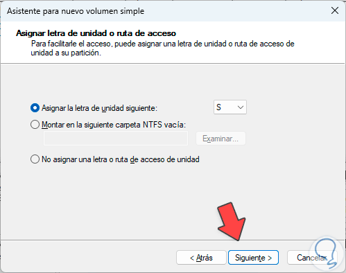 En la siguiente ventana vamos a definir la letra que se asignará para reconocerla en el Explorador de archivos y en el sistema: