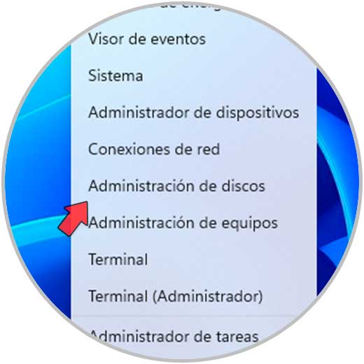 Para lograr esto desde el menú contextual de Inicio damos clic en “Administración de discos”: