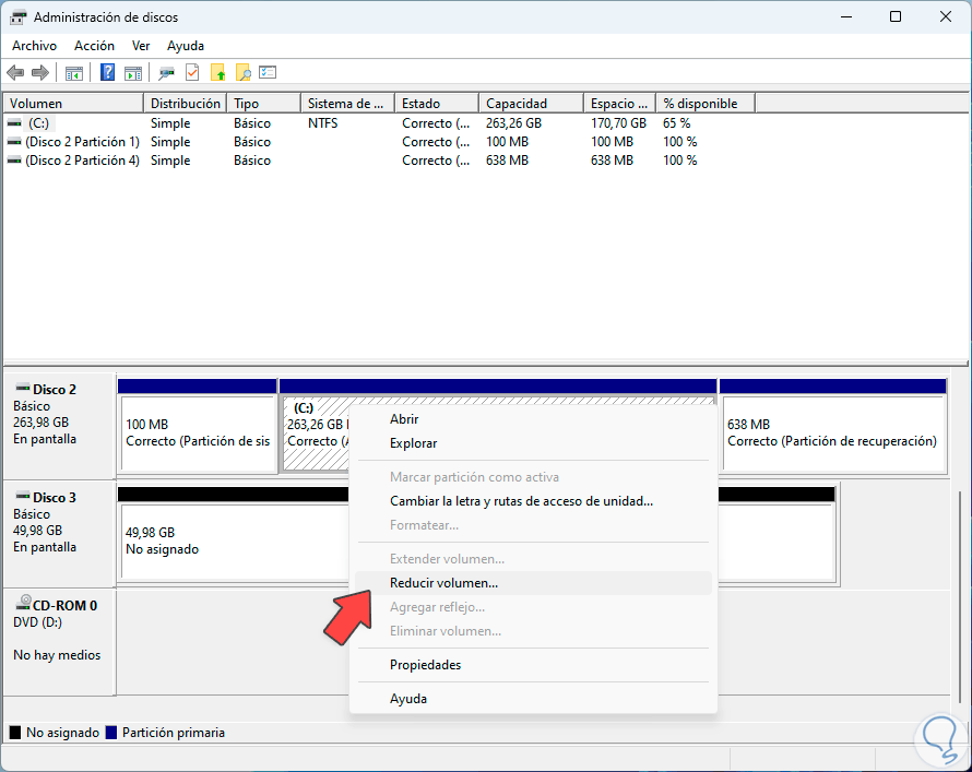 En el administrador que se abre tendremos acceso a todas las unidades disponibles, allí vas dar clic derecho sobre la unidad C y luego damos clic en la opción “Reducir volumen”: