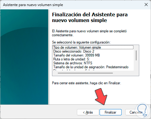Vemos que automáticamente se ajustan los valores del disco, una vez demos clic allí veremos la nueva partición con la leyenda “No asignado”: