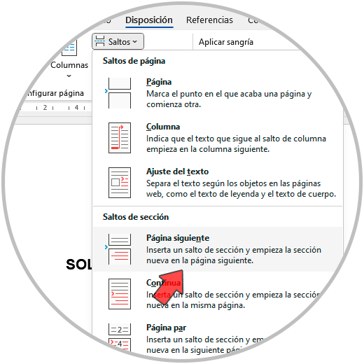 Si vemos esto debemos realizar un pequeño proceso para lograr la numeración desde otra página, vamos a ir al menú “Disposición” y allí damos clic en la opción “Salto - Página siguiente”: