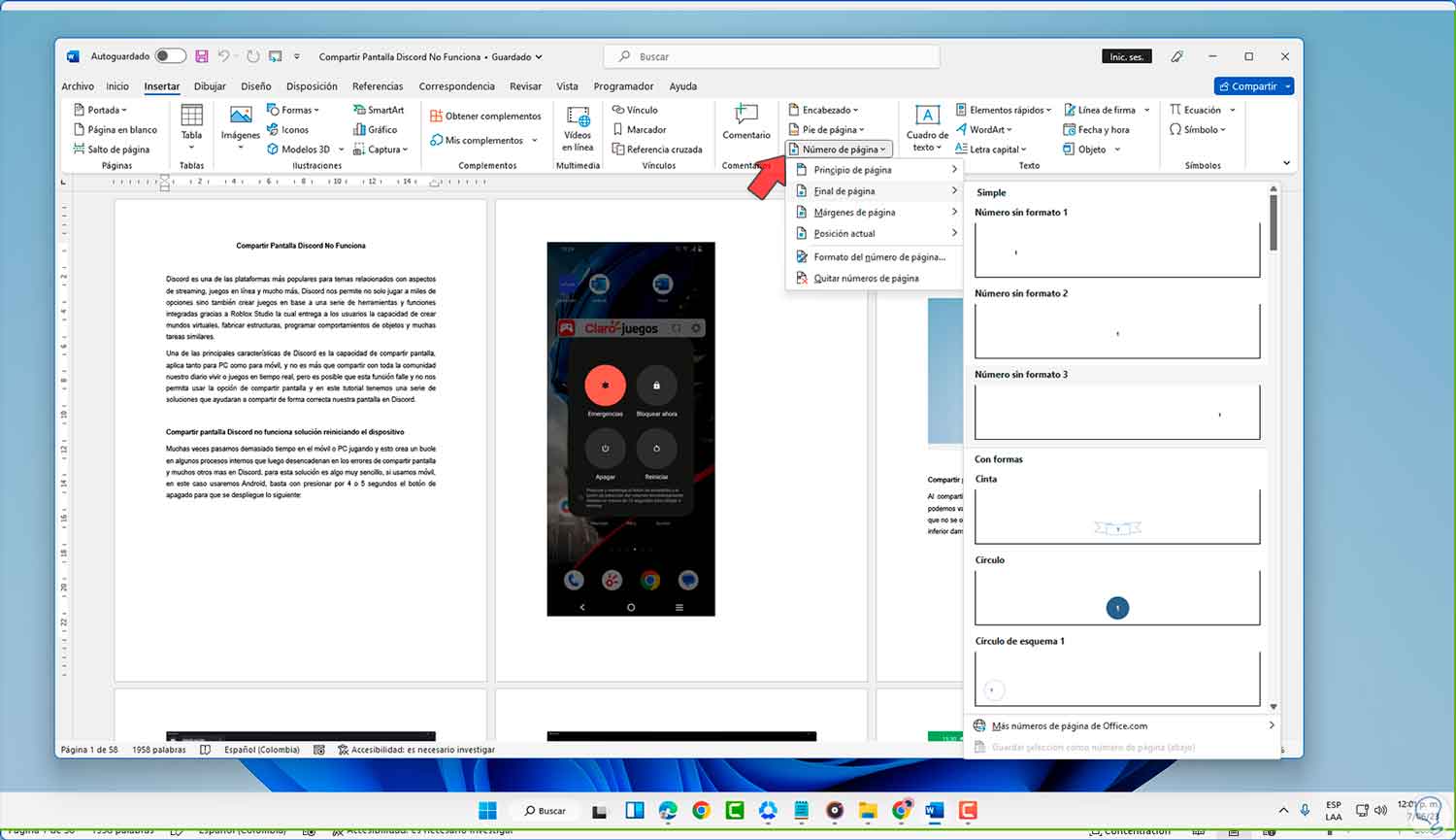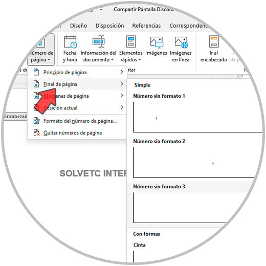 Después de esto damos clic en “Número de página” y vamos a clic en la opción que se ajuste a la necesidad para representar dicho número en el documento: