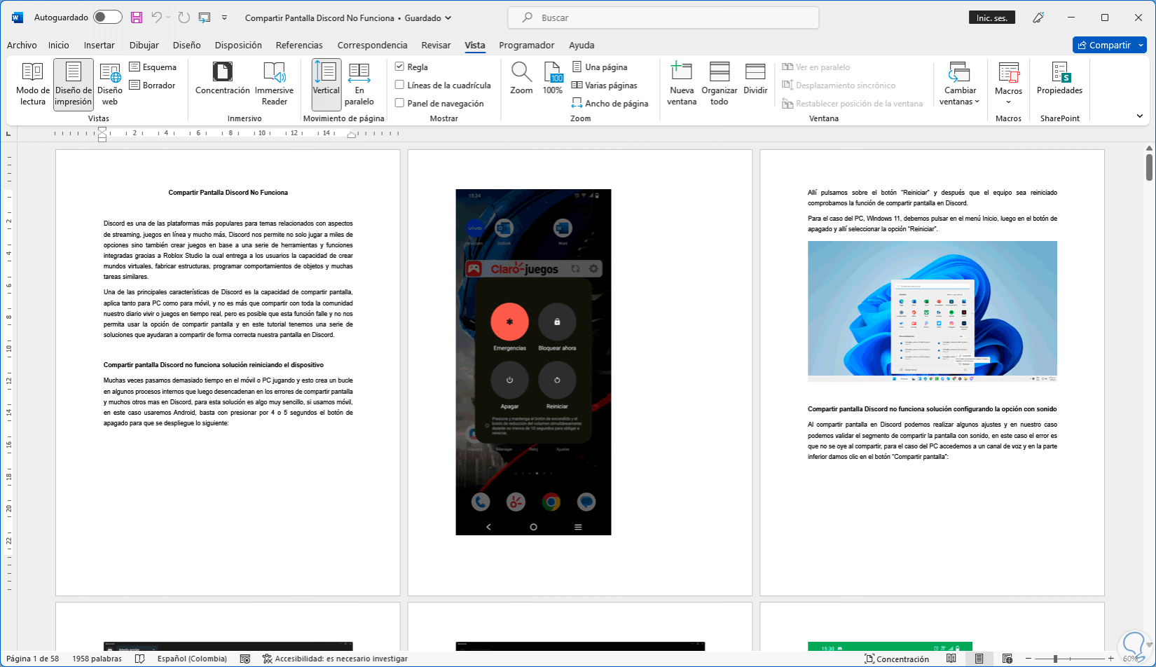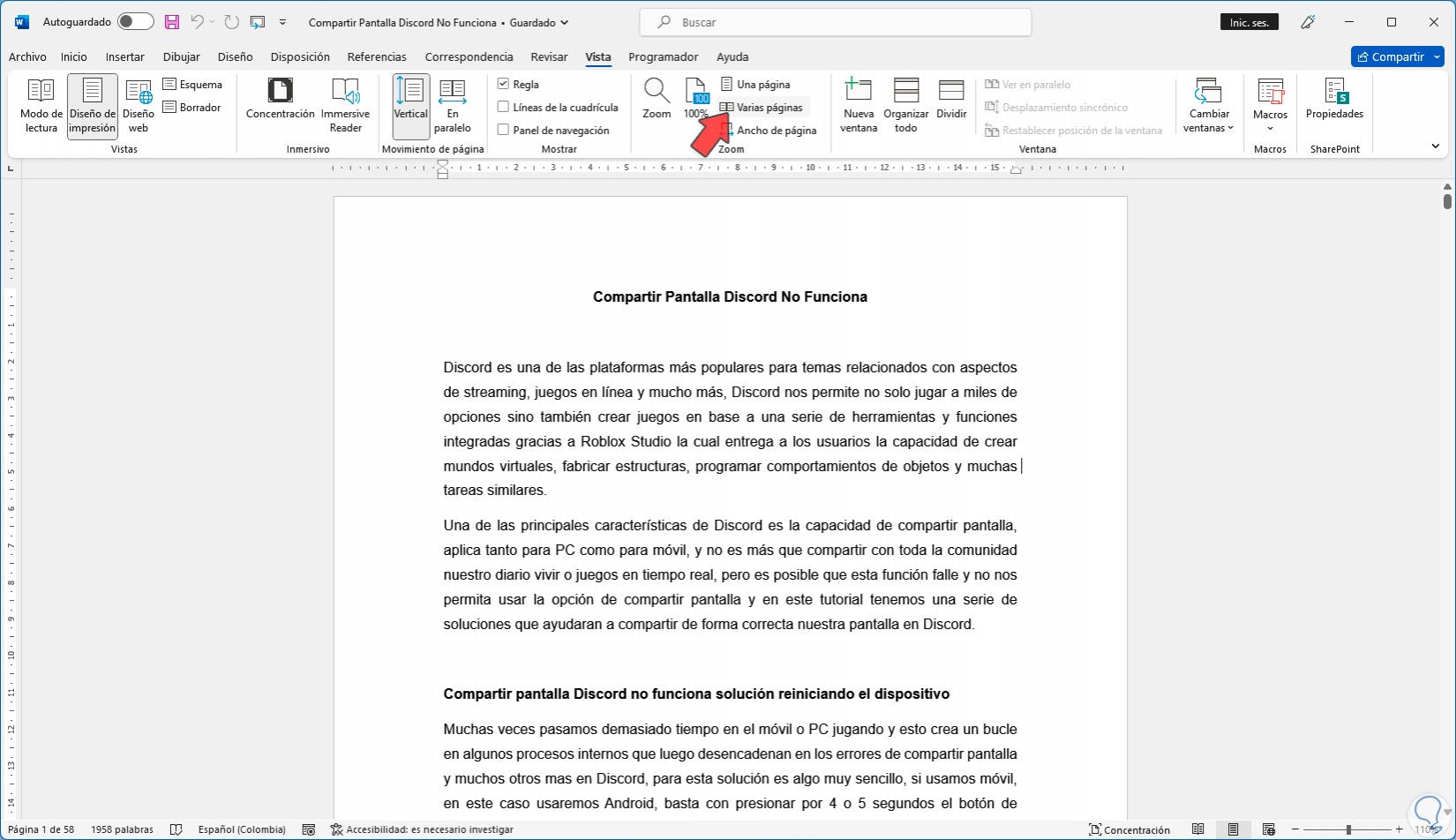 Para tener una mejor vista de las páginas y ver el proceso a realizar, vamos al menú “Vista” y allí en el grupo Zoom damos clic sobre la opción “Varias páginas”: