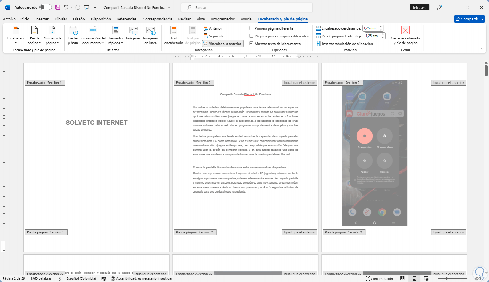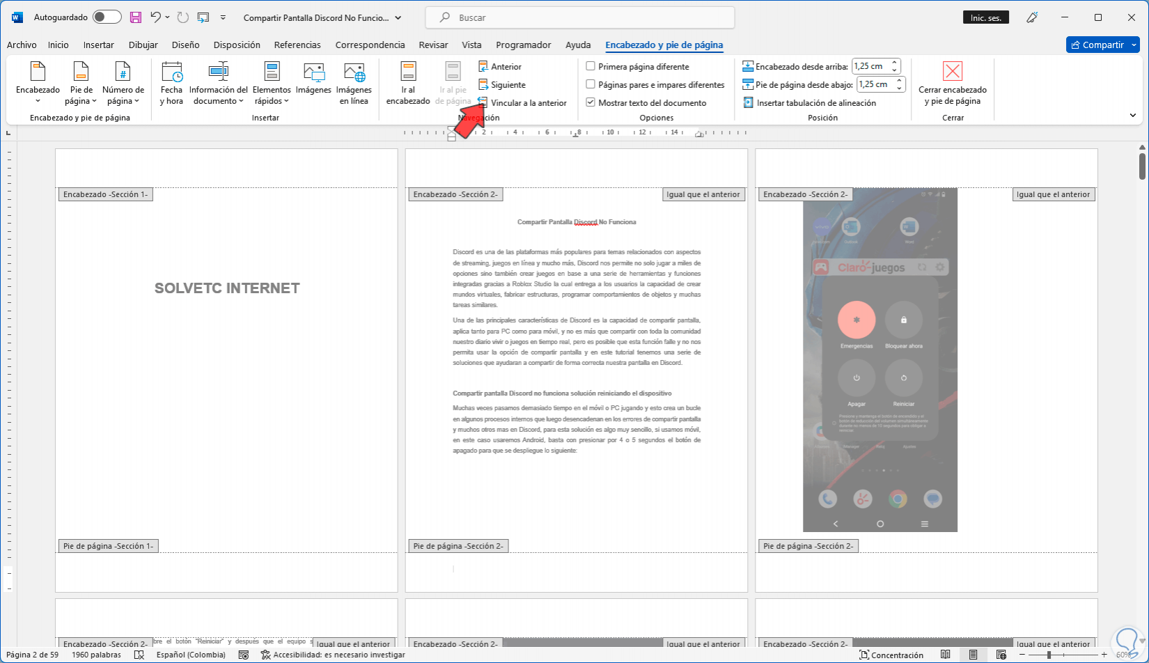 Esto modificará la estructura del documento, allí podemos ajustar el texto que se ha movido, luego de nuevo damos doble clic sobre el encabezado o pie de página y ahora veremos que esta disponible la leyenda Sección y su número respectivo: