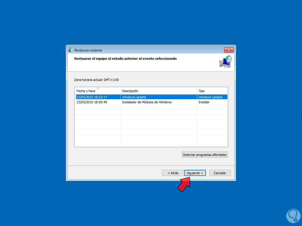Damos clic en “Siguiente” para seleccionar el punto de restauración deseado: