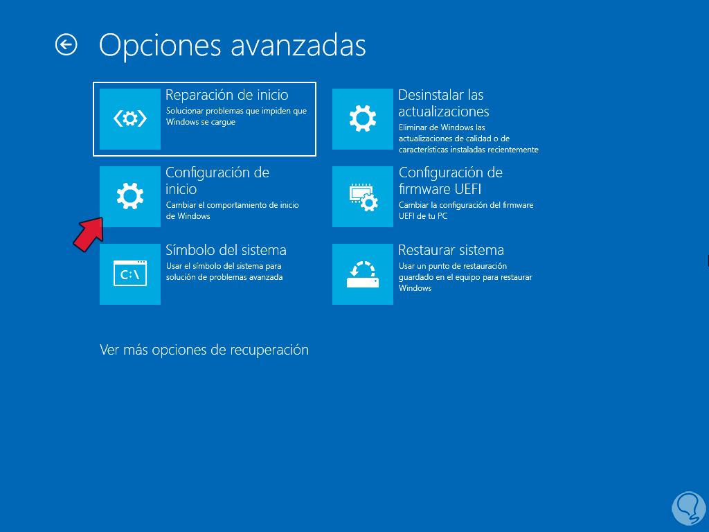 Accederemos a todas las opciones avanzadas. En el menú principal debes dar clic en la opción “Configuración de inicio” para tener acceso a lo siguiente:
