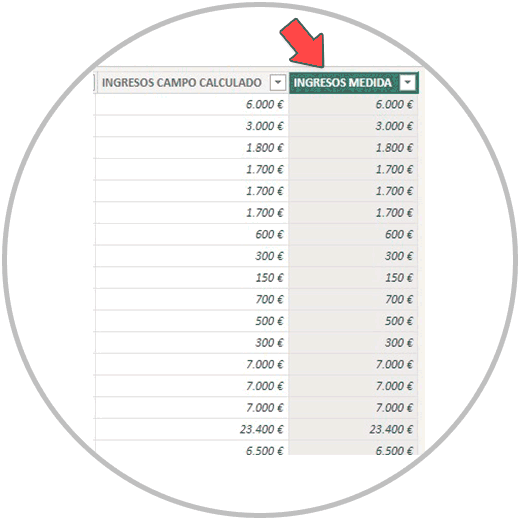 Por otro lado, en la misma tabla, a la derecha creamos otra columna que hemos llamado “INGRESOS MEDIDA“ donde vamos a especificar en la barra de fórmula simplemente que queremos que esa columna sea = a la medida creada. Mira en la imagen abajo, como podemos usar las medidas creadas también para realizar un campo calculado. Al empezar a escribir después del = el nombre de la medida, nos dejará seleccionar la medida creada para realizar el cálculo.