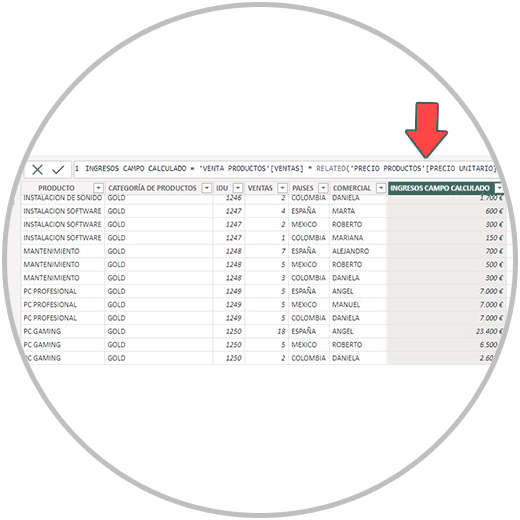 Para comprobar que la fórmula es correcta, podemos crear un campo calculado como ya sabemos, y explicamos en cómo hacer una columna calculada en Power BI. Añadiríamos una columna y realizaríamos la multiplicación. En otra columna, haríamos otro campo calculado donde solo tendríamos que especificar en la fórmula que la operación a realizar es = a la medida creada. Comparamos las dos columnas calculadas, y vemos si a nivel de fila obtenemos el mismos resultado. Mira en la imagen abajo como hemos creado una columna nueva que se llama “INGRESOS CAMPO CALCULADO” donde realizamos la operación sencilla de la multiplicación de la columna de las ventas por el precio unitario del producto, usando Related como ya sabemos porque el precio unitario se encuentra en otra tabla.