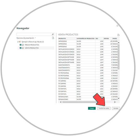 Una vez seleccionado el archivo, vamos a subir en este caso de ejemplo las dos hojas que contiene el EXCEL, ya que en una tenemos la tabla de hechos, y en otra tenemos el precio unitario de cada producto, para poder calcular después los ingresos. Tenemos que seleccionar por tanto las dos hojas y hacer clic en “Transformar datos”.
