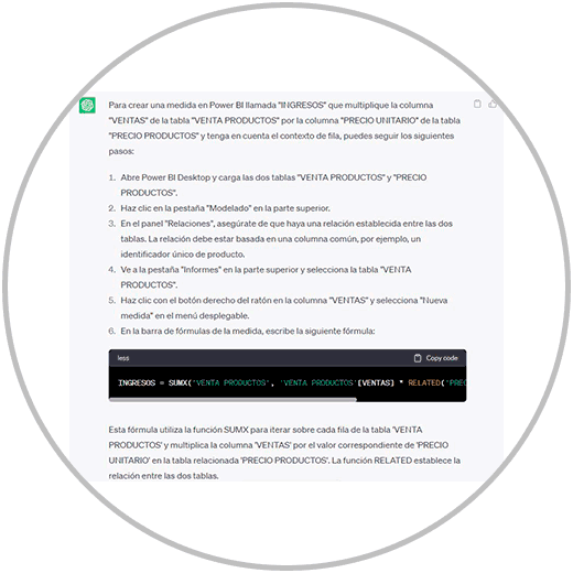 Cómo se puede ver, no estamos indicando en nuestra consulta ni la función que queremos usar, ni cómo debe crearla. Solo estamos explicando la operación que queremos realizar, indicando entre comillas los nombres de nuestras columnas y tablas de forma exacta, para poder obtener una respuesta personalizada; Y estamos diciendo que tenga en cuenta el contexto de fila, que en este caso será importante para poder realizar el cálculo correctamente ya que tenemos varios productos con precios diferentes. Por tanto, para poder calcular los ingresos de forma correcta, se debe multiplicar el N.º. de ventas de cada producto, por su precio unitario, y después realizar la suma de todos los ingresos por producto para poder tener el dato correcto total.