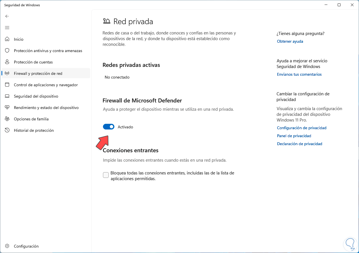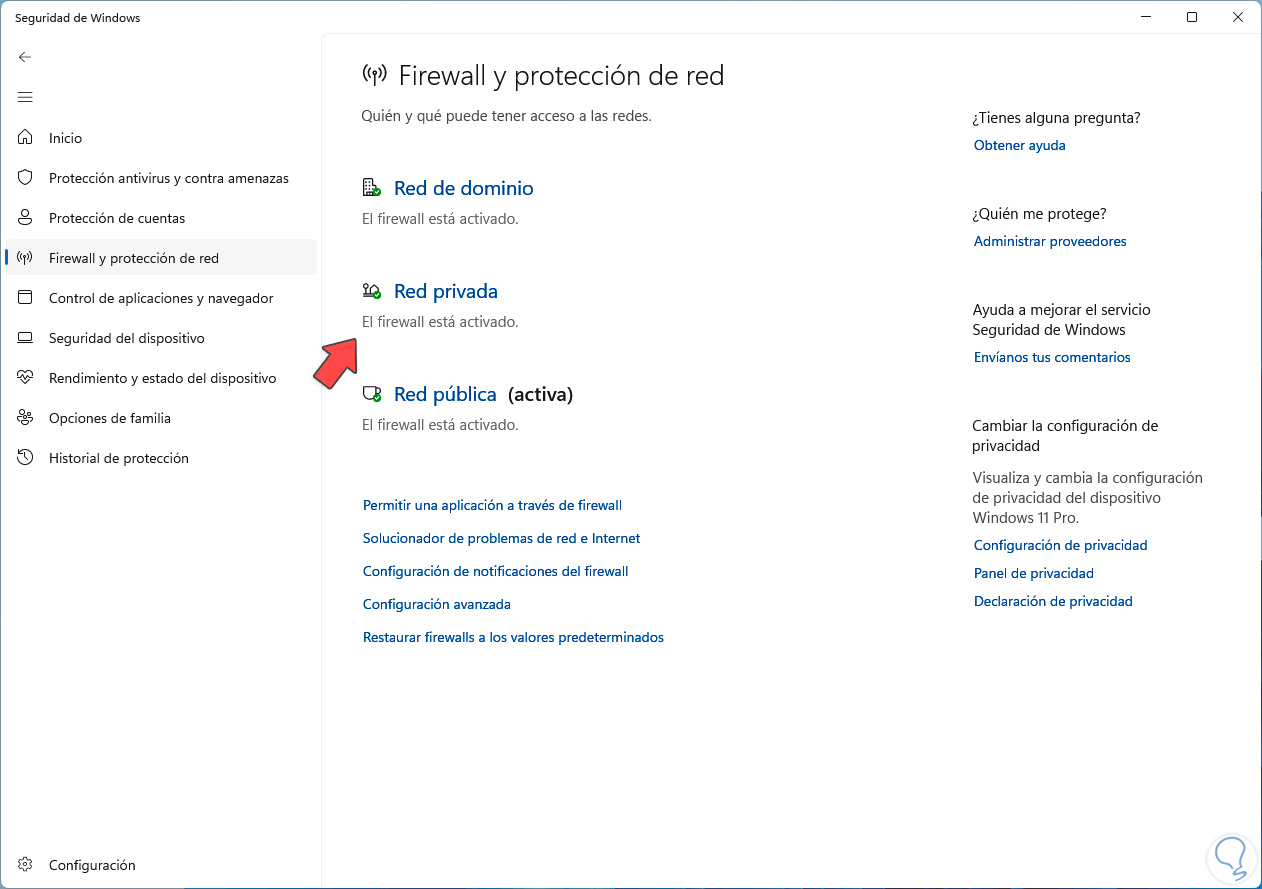 En la ventana desplegada vamos a la sección “Firewall y Protección de red”: