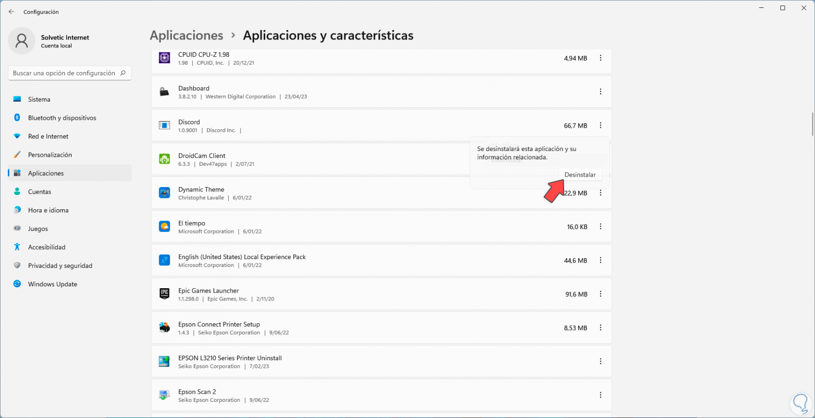 Vamos a ubicar Discord, una vez lo encontremos daremos clic sobre su menú contextual y seleccionamos la opción “Desinstalar”: