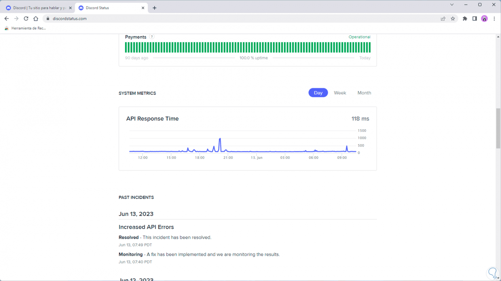 En la parte inferior de la ventana tendremos datos estadísticos del estado de Discord donde será posible ver latencias, hora y fecha de errores así como el error que afecto Discord:
