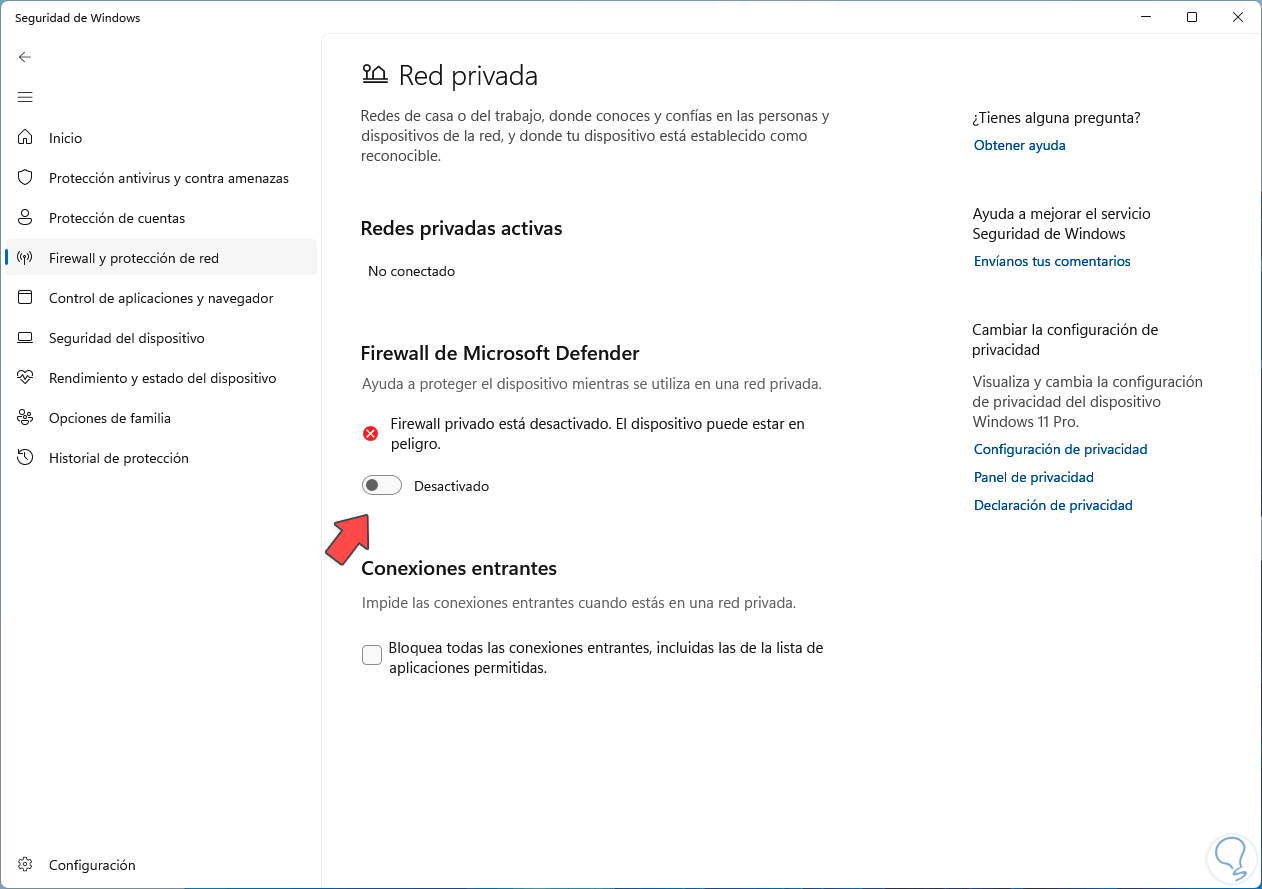 Allí vamos a desactivar el interruptor “Firewall de Microsoft Defender” y será necesario confirmar la operación: