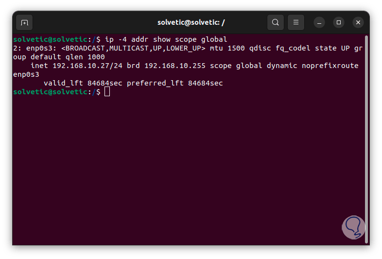 Ahora vamos a revisar la dirección IP del sistema, ejecutamos el comando “ip -4 addr show scope global” y debemos tener presente tanto la dirección IP como el nombre del adaptador de red: