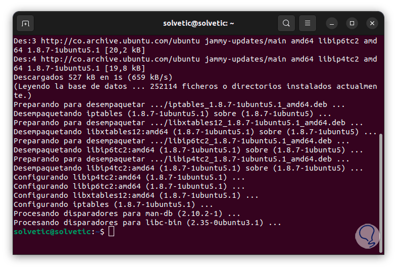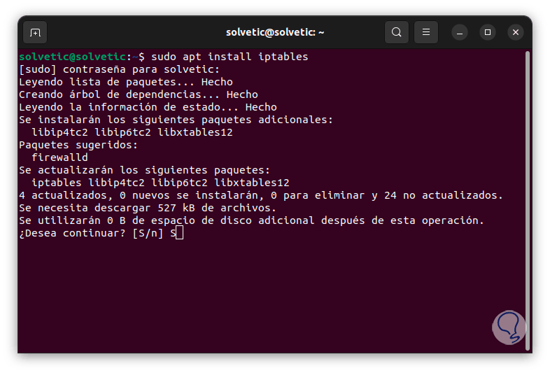 Para comenzar abrimos la terminal y allí vamos a instalar el administrador de filtrado de paquetes Iptables usando el siguiente el comando: