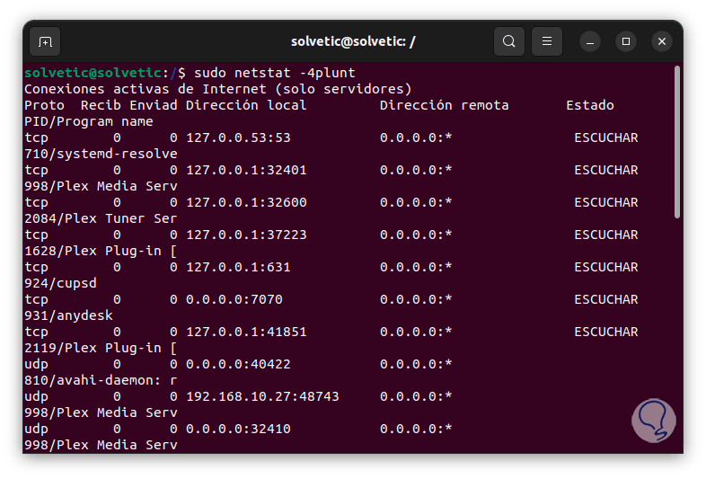 Ahora es momento de revisar los puertos usados en el sistema, para ello vamos a ejecutar el comando “sudo netstat -4plunt” el cual listará todos los detalles necesarios: