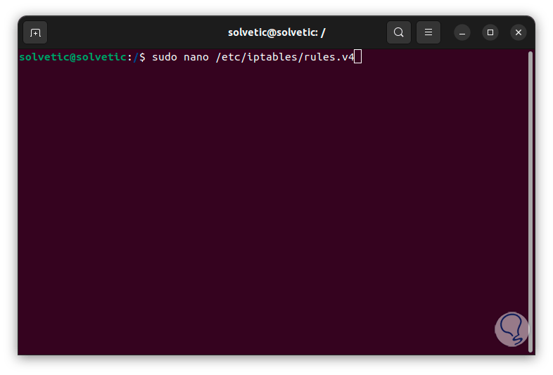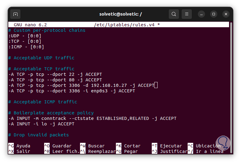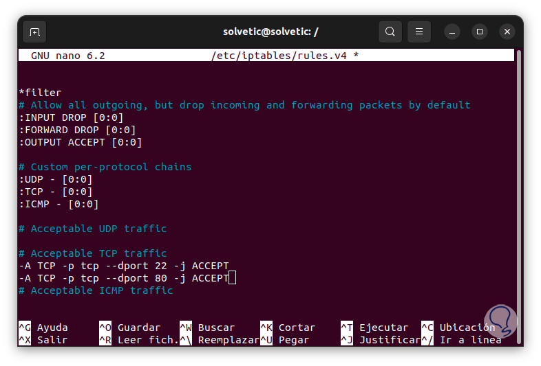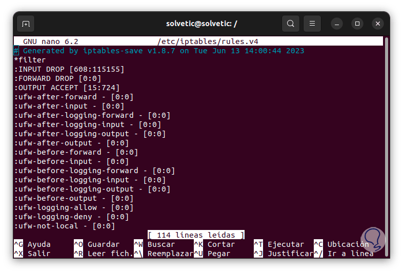 Una vez se haya instalado la utilidad, vamos a usar algún editor para acceder al archivo de configuración de las reglas IPv4, en este caso ejecutamos el siguiente comando: