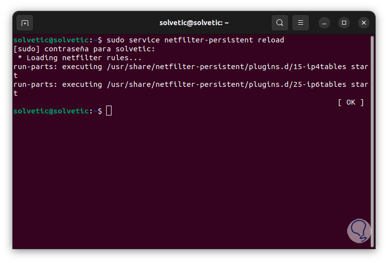 sudo service iptables-persistent reload sudo service netfilter-persistent reload