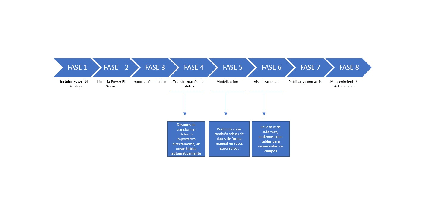 Para hacer una tabla, dentro de la fase de visualización de los datos o informes, tenemos que haber pasado por las fases anteriores de Power BI. No es completamente necesario el transformar los datos, pero ya vimos que es recomendable siempre para poder revisar de nuevo los datos con los que vamos a trabajar, y realizar algún cambio si fuera necesario.