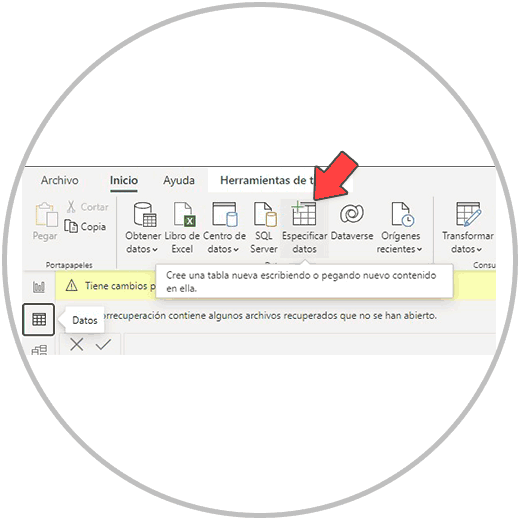Si por algún motivo durante la realización de tu proyecto, necesitas crear una tabla, hay que pensar primero que esta tabla se puede crear en Excel también y después la puedes importar a Power BI Desktop y conectarla a nuestro modelo. Si quieres crear la tabla directamente en Power BI, podremos hacerlo en cualquier momento desde el menú de inicio, en la barra de tareas, con la opción “Especificar Datos”, tal y como puedes ver en la imagen de abajo.