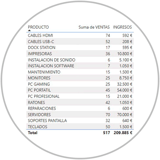 Podemos crear una tabla de datos para ver a nivel de producto, cuantas ventas se han realizado en total. Como en la imagen que te mostramos abajo.
