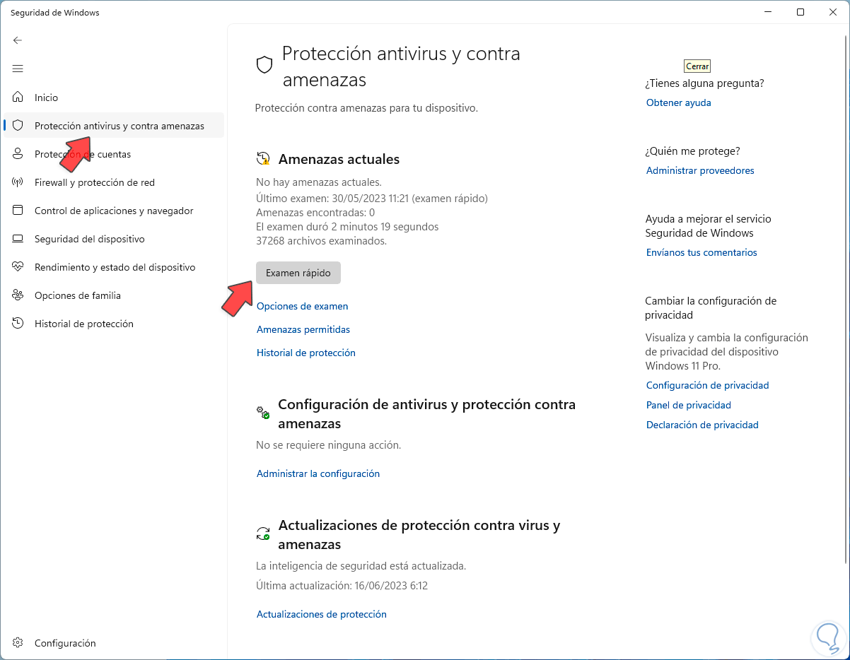 Luego vamos a dar clic en “Examen rápido” para ejecutar en análisis del sistema en busca de virus: