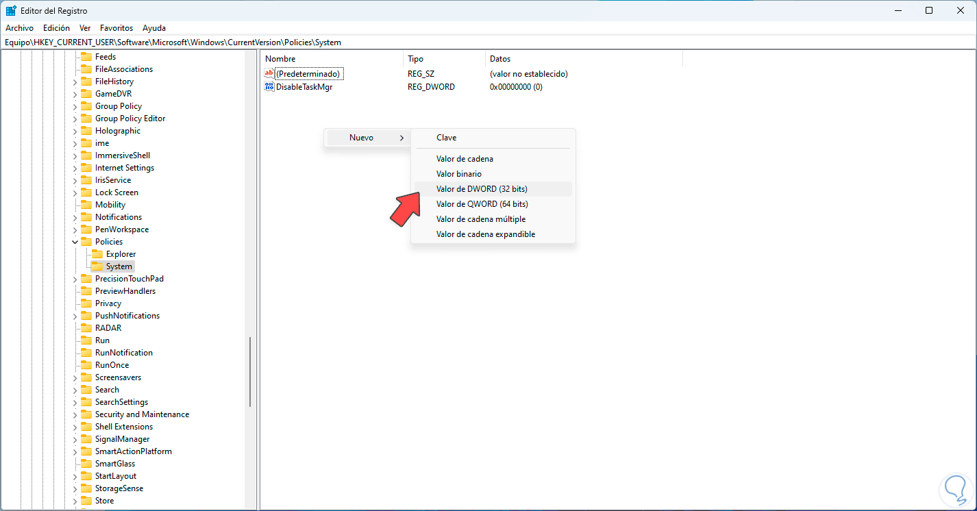 En el panel damos clic en el registro llamado “DisableTaskMgr.”, si no existe vas a dar clic derecho en algún lugar y luego seleccionas “Nuevo – Valor de DWORD (32 bits)”: