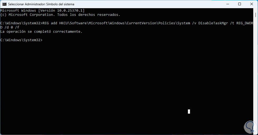 A través de la consola de CMD podremos ejecutar un comando para establecer los permisos de acceso al Administrador de tareas directamente editando el registro de Windows.
