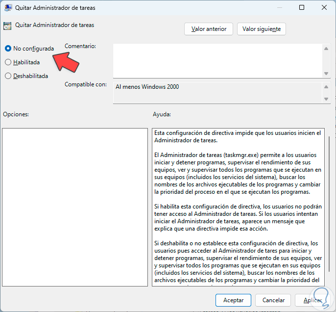 En la ventana desplegada será posible activar dos opciones, No configurada o Deshabilitada: